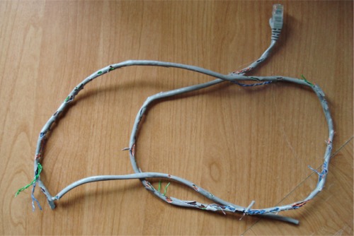 Pixel however loves to chew. He has brought the internet down in the flat and eaten the phone cable twice. Steven’s laptop cable was totally destroyed costing in £60 for a replacement. His new cable has bite marks in it and Marks cable has bite marks covered in duck tape. This is what happened when we gave him a cat 5 to play with:
