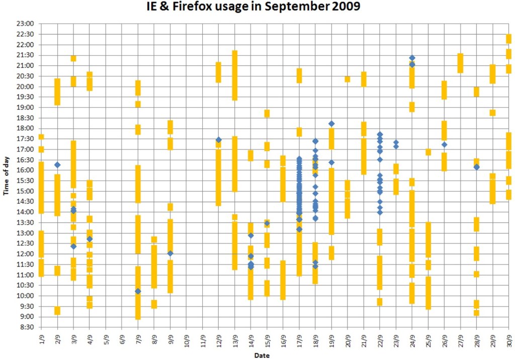 I have updated my graph of internet usage to include Firefox. Almost afraid to admit how much I went on the internet during September! Firefox is in orange and IE in blue.