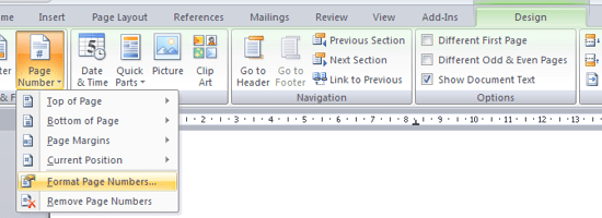 Secondly, you need to click on “Page Number” in the same tab, then “Format Page Numbers”. Here you can choose any number to start to pages from, and also if you want them in Roman Numerals or Letters. Do the same section 3, unlinking it from the previous section and changing the numbers to start from one.