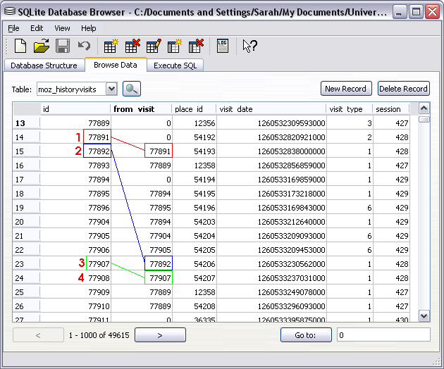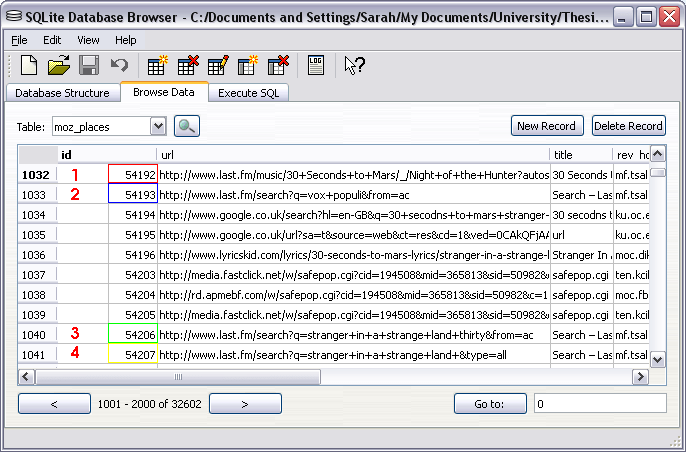 Using from_visit and place_id it is possible to retrace a user’s steps and see how they got to a particular page. Using the two images below, it can be shown that an example user accessed three additional pages on the website http://last.fm after they accessed it for the first time. In between these visits, the user also searched on Google for lyrics and followed a link – this can happen because they were using tabbed browsing or had two instances of Firefox open to access multiple websites at the same time. This is confirmed by the session being different for both sets of URLs. moz_places only stores the unique URLs accessed, but combined with moz_historyvisits a full account of the user’s online history can be made. Every URL impression is stored in moz_historyvisits, so the number of entries will be considerably more if the user visits a URL more than once.