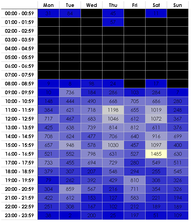 I’ve nearly finished Webscavator, my visualisation application for the forensic analysis of user web history! The next series of blog posts will describe some of the visualisations I’ve used and how to code them. They are all written in server-side Python and client-side Javascript using jQuery. First on the list are heatmaps. These visualisations show the data using colour. For example low values go blue and higher values go red to visualise a temperature scale. A couple of examples can be found at heatmapapi.com, Google Visualization API and GraphUp. I found the Google Visualization API too limiting to work with for this particular visualisation, and GraphUp is not free or open source, so I made my own, described below.