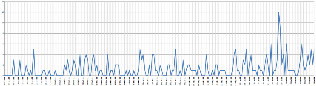 Work has begun on making Webscavator more community open-source based, so the code has been put into github and the issues and bugs that need fixing will shortly go in there or some other free bug tracking tool. Also I will set up a mailing list for those who want updates. Since I haven’t yet put Webscavator on my Google Analytic’s panel (d’oh!) I have to make do with parsing out my Apache logs. Unfortunately because it’s on a virtual machine all the IP addresses in the Apache logs are from the OS that is hosting the VM rather than from the requesters to the site (double d’oh!). Once I got rid of all the lines from bots and those not to the homepage, I came up with a 320 visitors to Webscavator since January 2011. Since I’ve not really been advertising it, I think that’s a fair amount!