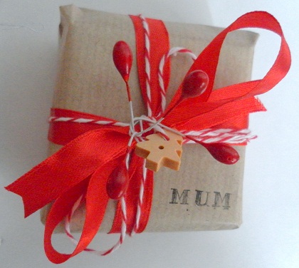 For the very basic wrap you will need brown packaging wrapping paper and red ribbon. I then accessoried mine by adding Bakers twine (red and white string) with the red ribbon, and threading through a little wooden Christmas tree button. I added some red bobble-type things from Hobbycraft and stuck on some stencils of snowflakes using my snowflakes cutter. Finally, I stamped the person’s name on the gift rather than using traditional tags.