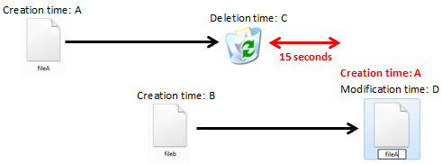 However, if the delete/replace happens in less than 15 seconds, then File A will retain its original creation date! This can be shown in Figure 2, where file B has again replaced file A, but instead of having file B’s creation timestamp, it now has file A’s creation timestamp.