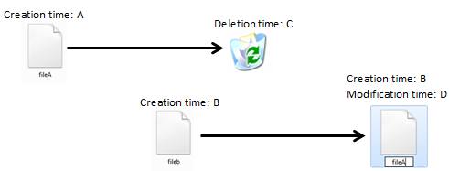 Unfortunately this ‘feature’ means that creations times for files are often not quite correct. Take figure 1. This is what you would expect to happen when you have a file A, and replace it with file B. File A has been deleted and file B renamed to file A. The new file A has the creation timestamp of File B, as it was this file in the first place.
