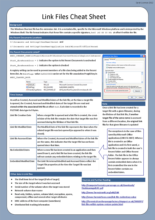 I have created a one page ‘cheat sheet’ for Windows link file analysis. The information comes mostly of the link file paper written by Harry Parsonage who has kindly allowed me to use his wording for the cheat sheet. I hope to make a series of these on different forensics topics so if anyone has any suggestions please get in touch or add a comment to this post.