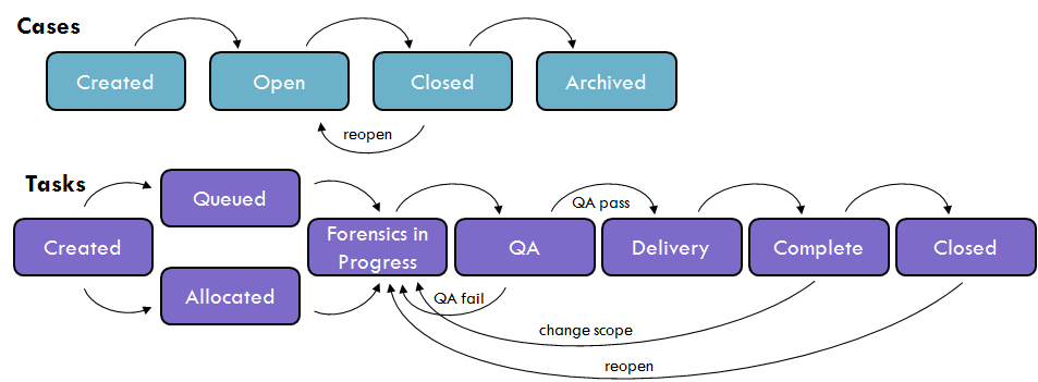 Cases are made up of tasks, which can be divided out to different forensic investigators. For example, there may the task of imaging a device, followed by analysis and a report. A junior member of staff may carry out the image, and a senior member may carry out the analysis & report tasks. Cases can be in one of four states; created, open, closed, archived. A created case is not yet ready to be worked on. This stage would be for the requester and case managers to agree on the tasks and scope of the case. Tasks will generally be added to the case at this point, also in their created stage. Once agreed, the case can be opened.